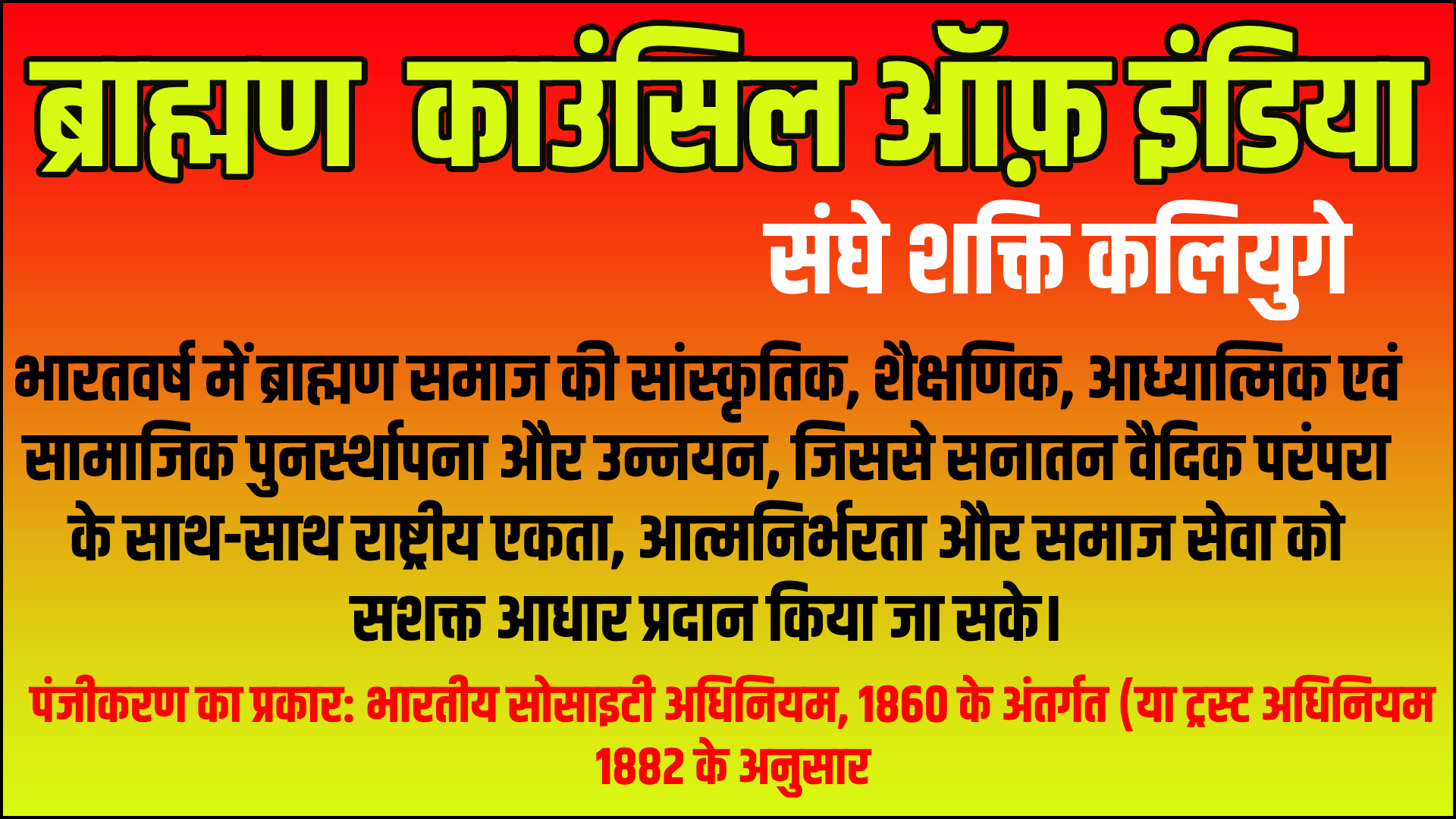 “भारतवर्ष में ब्राह्मण समाज की सांस्कृतिक, शैक्षणिक, आध्यात्मिक एवं सामाजिक पुनर्स्थापना और उन्नयन, जिससे सनातन वैदिक परंपरा के साथ-साथ राष्ट्रीय एकता, आत्मनिर्भरता और समाज सेवा को सशक्त आधार प्रदान किया जा सके।”